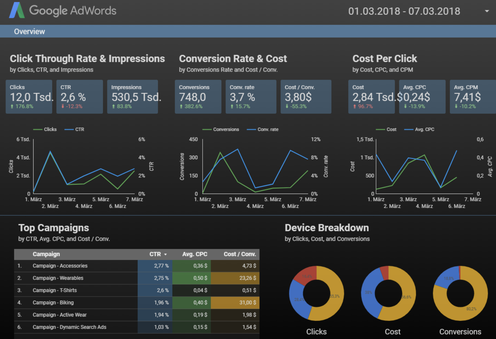 In der heutigen Zeit werden mobile Geräte immer wichtiger. Immer mehr Nutzer kaufen über das Smartphone. Daher ist es sehr interessant zu analysieren, über welche Geräte ein Nutzer den Kauf oder das Kontaktformular abschließt. Ein Bericht, der nach Geräten segmentiert ist, bietet Aufschluss darüber, ob gewisse Geräte eine höhere CR aufweisen als andere. Als Maßnahme würden Sie die Gebote für die Geräte entsprechend der Performance nach oben anpassen oder auch mit -100% ausschließen.