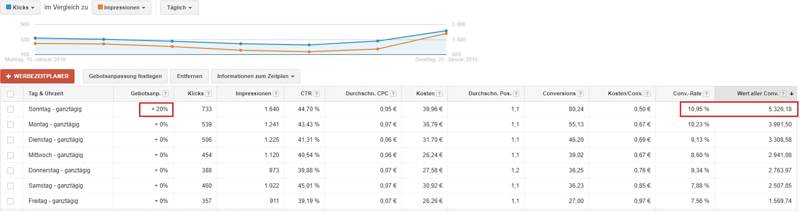 Um herauszufinden, an welchen Wochentagen die CR besonders hoch ist, segmentieren Sie sich einen Bericht nach Wochentagen. An Wochentagen mit besonders hoher CR, würden Sie die Gebote nach oben anpassen. Werbeaktionen können schwächere Wochentage dabei unterstützen, die CR zu steigern.