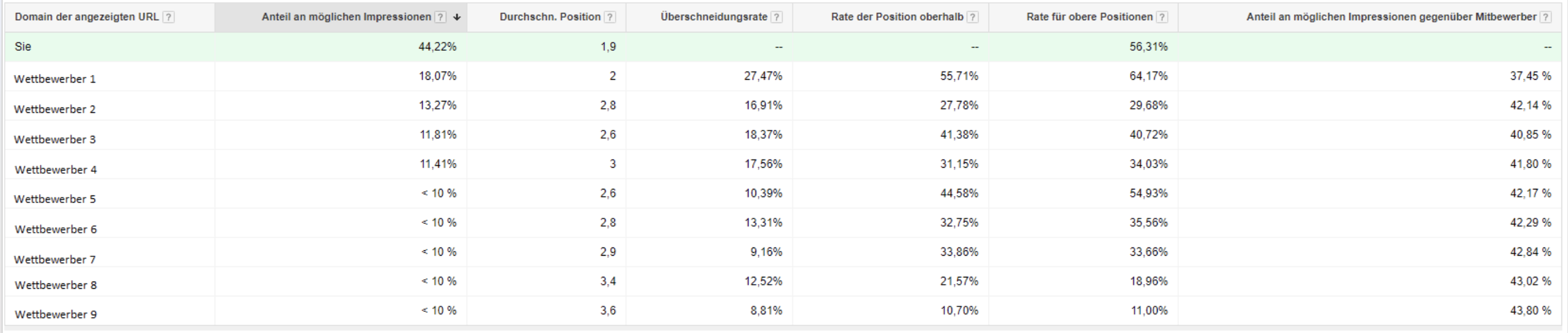 Entwicklungen im Konto können verschiedene Ursachen haben. Beispielsweise beeinflussen externe Faktoren, wie Saisonalitäten, neue Mitbewerber oder Wochentage Ihre AdWords-Leistung. Die Wettbewerber-Situation können Sie mithilfe des Auktionsdaten-Berichts analysieren. Dort sehen Sie die Überschneidungsrate und die Rate für die oberen Positionen der Wettbewerber. Sie erkennen ebenfalls, wenn neue Wettbewerber hinzukommen oder andere nicht mehr auf Ihre Keywords bieten. Ein weiterer Faktor, der die AdWords-Leistung beeinflussen kann, sind innerbetriebliche Faktoren, wie Werbeaktionen aber auch weitere Online- und Offlinekanäle. Nicht zu vergessen die Veränderungen im AdWords-Konto (Gebotsänderungen, Budgets, Anzeigen, etc.), die in den Daten sichtbar werden.